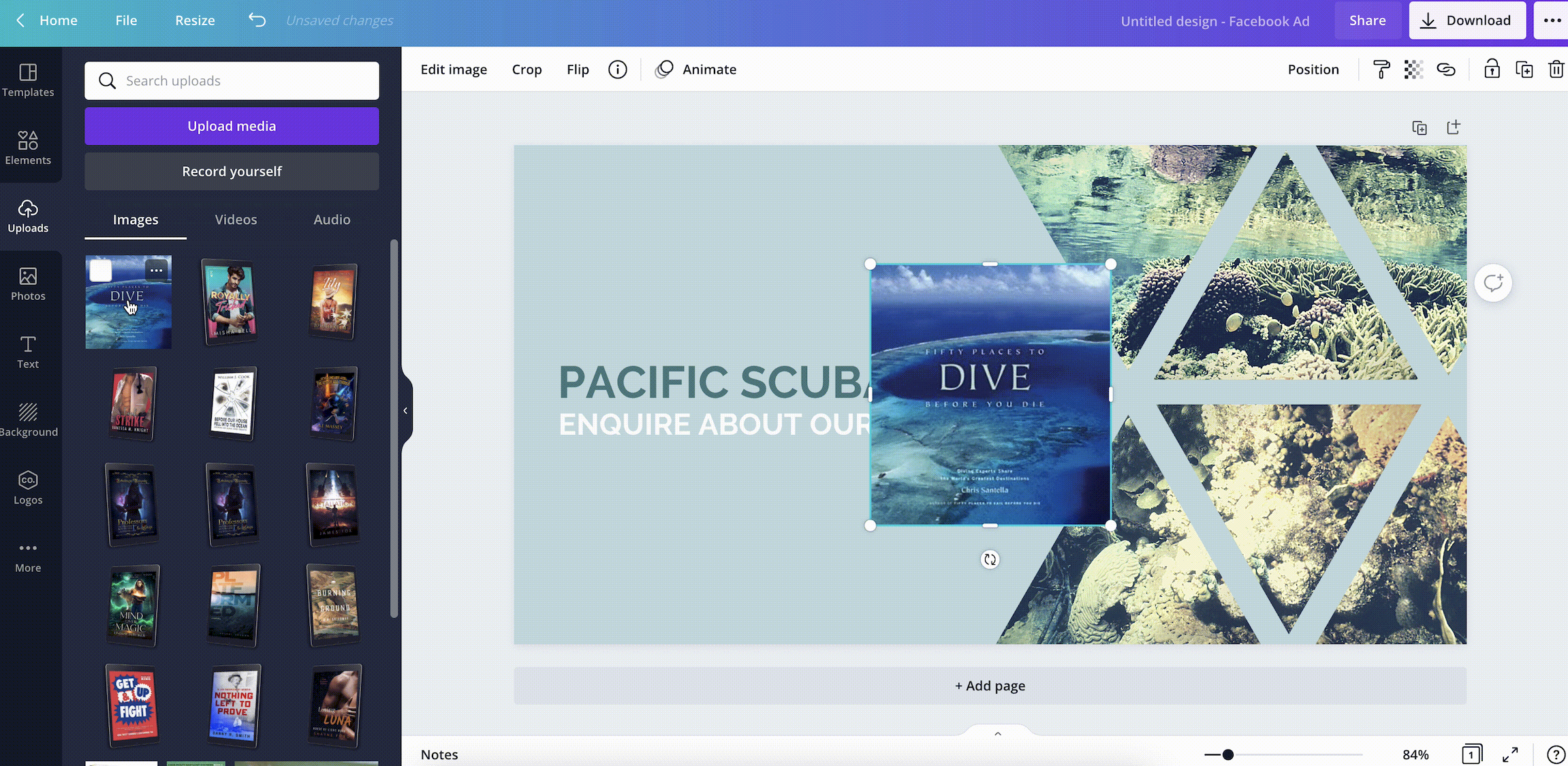 A quick note on the text: Making the ad look great is more important than making the ad accurate! In our example, we have the text “Fifty Places to Dive Before You Die”. This does not do the book justice at all, but looks good, so we go with it.