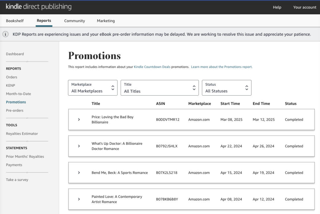 - Upcoming, ongoing, or past Kindle Countdown Deals and Free Book Promotions
