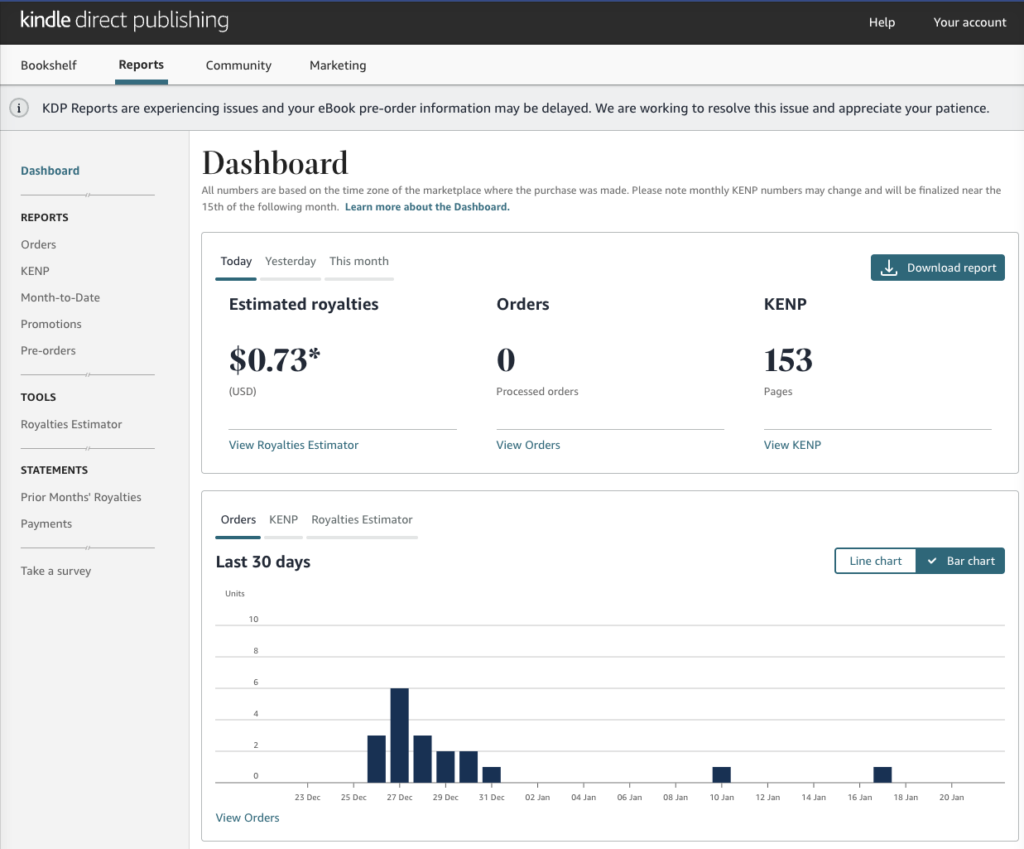 From there, you’ll land on the KDP Reports tab, aka your KDP Reporting Dashboard.